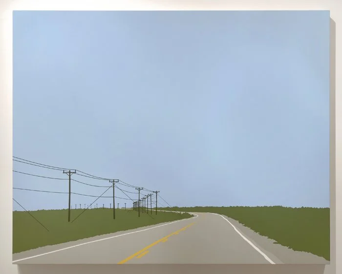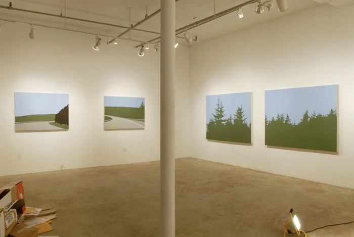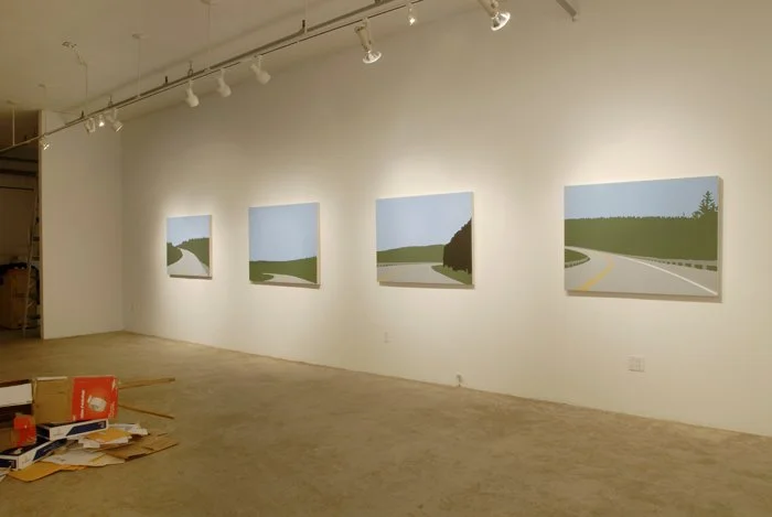 TCH is a series of paintings which takes as its' central theme an exploration of Newfoundland landscape. I seek to simplify the representation to create a more mediated interpretation, where the geography of Newfoundland can be appreciated in a more graphic form. These paintings do not romanticize the natural environment, but rather reveal a more transparent and direct observation of the landscape as we experience it. Roads and highways, rather than being edited out, are included in the images, from the vantage point through which most of us experience the natural geography.