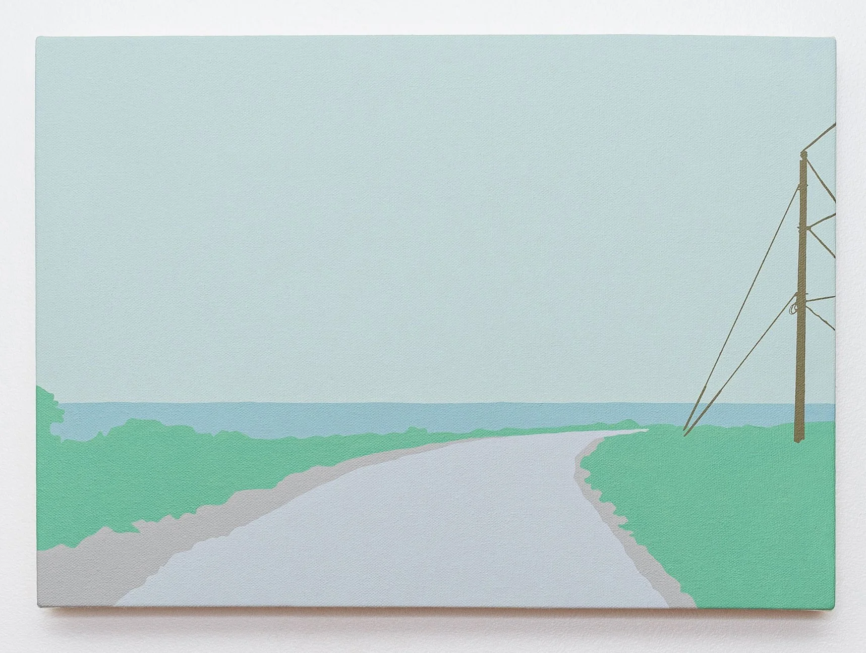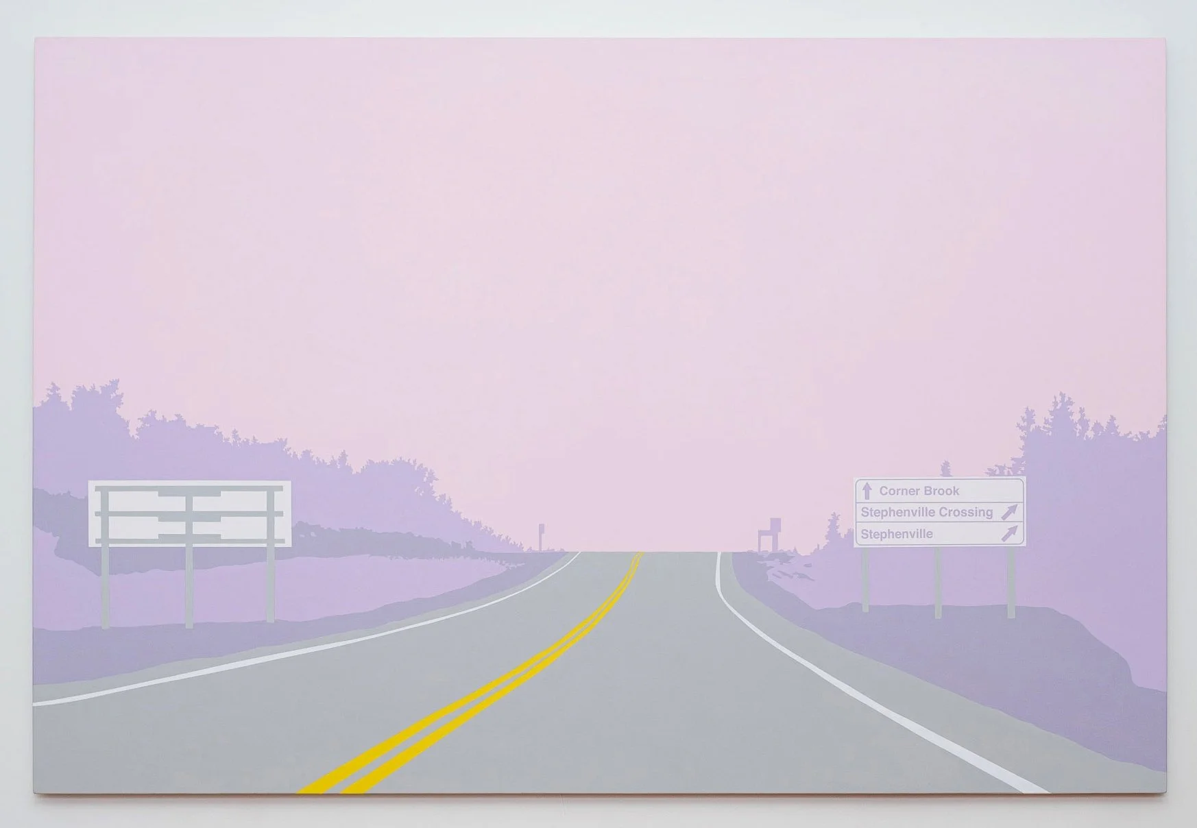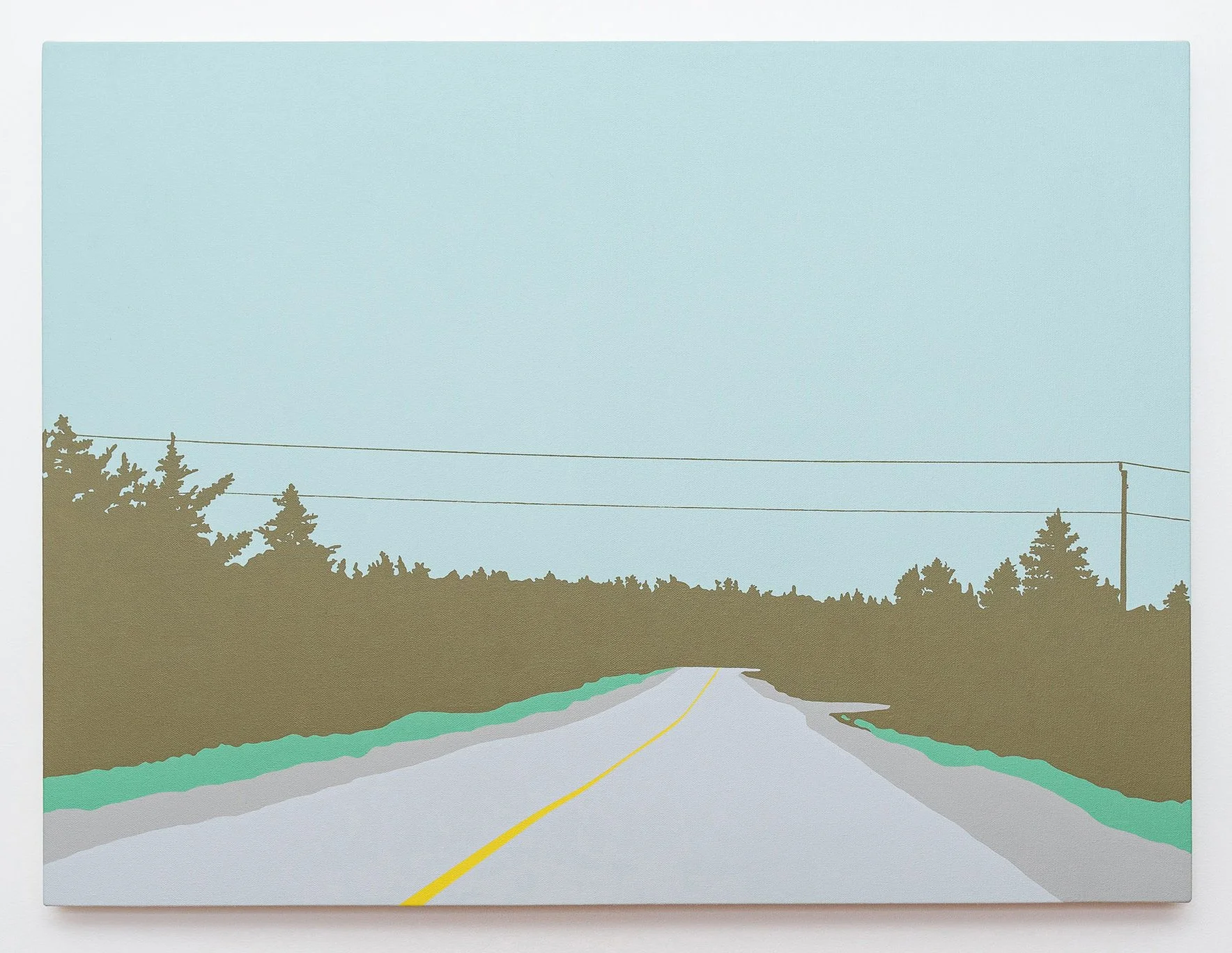 Travelling on the TCH across Newfoundland onward to the Codroy Valley, Greeley documented the landscape with a high-resolution camera mounted on the dashboard of her car. Using the fixed perspective of the windshield as a compositional frame, the images were the source material for each painting. Greeley explores the modern experience we have of a place, as seen through the window of a car and the lens of a cell phone camera. Greeley explores the modern experience we have of a place, as seen through the window of a car and the lens of a cell phone camera. Her family takes a quick 30 minute walk through the Grand Codroy Estuary, an hour playing on a sandy beach in Searstown, listening to endless descriptions of the Starlite Trail that will never be experienced. In some ways, Greeley says, that she will never know her land like her farming or fishing ancestors. Driving through and upon this land, she notes every turn, curve, pothole and telephone pole in her own ritual of knowing. Traversing the long expanses of road stretching between communities, each minor change grows in significance in a sea of repetitive visuals.