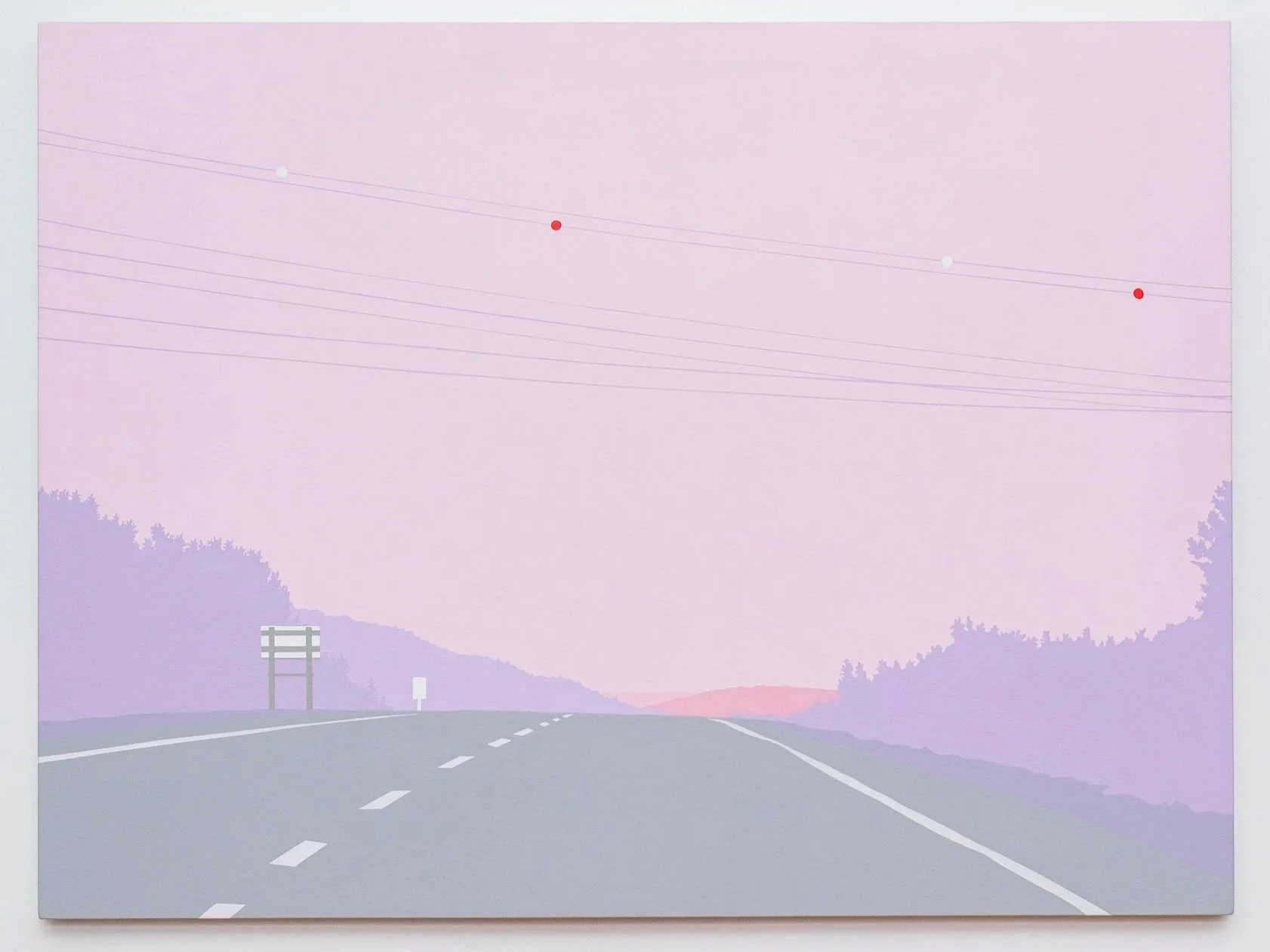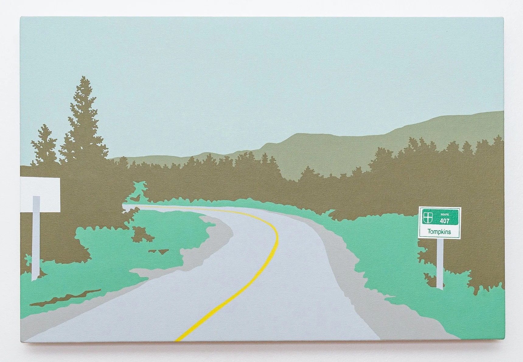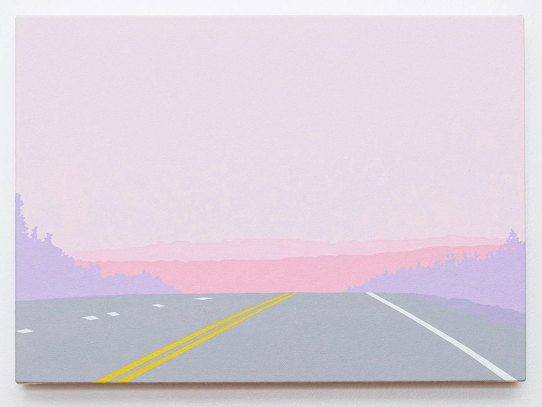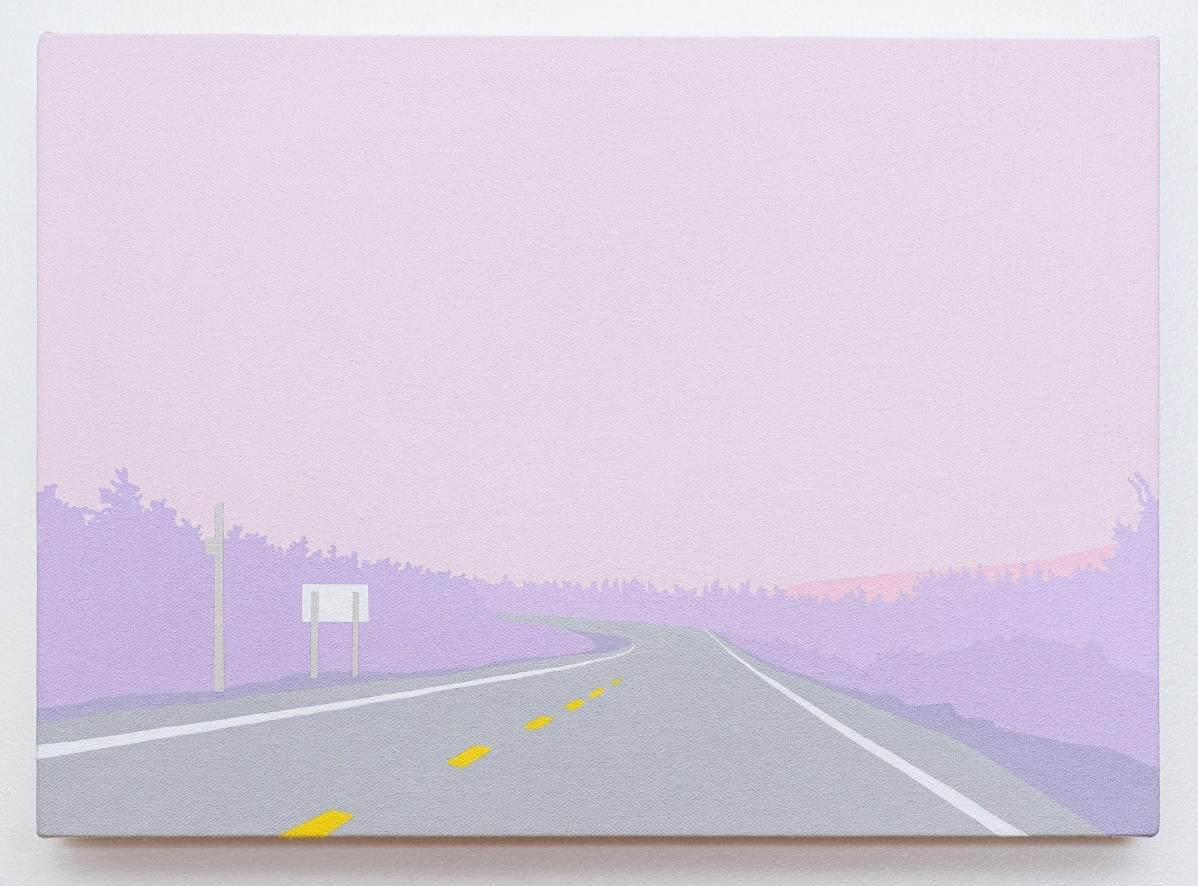 Travelling on the TCH across Newfoundland onward to the Codroy Valley, Greeley documented the landscape with a high-resolution camera mounted on the dashboard of her car. Using the fixed perspective of the windshield as a compositional frame, the images were the source material for each painting. Greeley explores the modern experience we have of a place, as seen through the window of a car and the lens of a cell phone camera. Greeley explores the modern experience we have of a place, as seen through the window of a car and the lens of a cell phone camera. Her family takes a quick 30 minute walk through the Grand Codroy Estuary, an hour playing on a sandy beach in Searstown, listening to endless descriptions of the Starlite Trail that will never be experienced. In some ways, Greeley says, that she will never know her land like her farming or fishing ancestors. Driving through and upon this land, she notes every turn, curve, pothole and telephone pole in her own ritual of knowing. Traversing the long expanses of road stretching between communities, each minor change grows in significance in a sea of repetitive visuals.